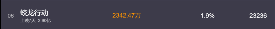 截至目前,《蛟龙行动》票房仅有2.9亿,如果说票房反映的是过往观众对这部电影的认可程度,那么只有5%的排片比例则说明了院线对这部电影的未来也很不看好。