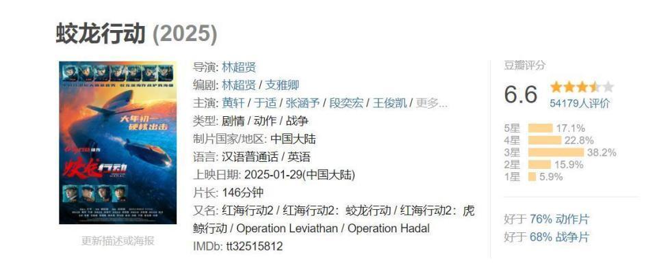 其实电影的口碑还算不错,豆瓣开分6.6分,除了《哪吒2》8.5分外,《唐探》6.7分,《封神2》6.5分,单单从评分上看《蛟龙行动》和这两部电影相比并不落下风。6.6分,虽然不算高,但也不低,说明看过的观众对这部电影的整体质量还是比较认可的。
